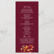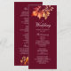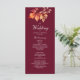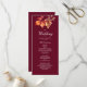 Este cartão de programa de casamento de outono elegante apresenta um fundo borgonha profundo com folhas de outono em aquarela em vermelho rico, laranja e dourado. O layout vertical torna fácil exibir os detalhes da cerimônia, leituras e seleções de música em um formato claro e clássico. Perfeito para casamentos de setembro, outubro ou novembro com um tema romântico, rústico ou sazonal.