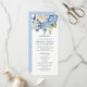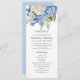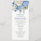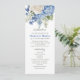 Design de casamento floral elegante com arranjos florais pintados a aquarelas de flores azuis de hydrangea, verde e rosas brancas.