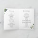 Este moderno programa de casamento dobrado por um ramo de oliveira é perfeito para um casamento de boho. O design rústico, porém elegante, apresenta folhas botânicas de cor aquática simples e azeitonas pretas num pequeno galho com um toque mediterrânico clássico.