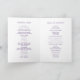 Simples programa de casamento dobrado com um design moderno, mas elegante. O cobrir tem seu monograma inicial junto com seus detalhes de casamento em branco sobre um fundo roxo. A dentro tem a festa de casamento do lado esquerdo e a ordem da cerimônia do lado direito. A parte de trás tem seu obrigado pessoal. Todas as cores do elemento design podem ser alteradas na ferramenta de edição de design. Um design chic e na moda que é excelente para um casal minimalista.