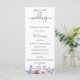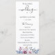 Elegantes flores e folhagens em azul poeira e rosa aquarela, programa de casamento. O programa apresenta um acento de caligrafia fofa de "casamento" com várias linhas para listas de texto personalizadas para a ordem dos eventos da cerimônia, festa de casamento e nota de agradecimento.