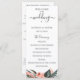 Trópicos modernos com flores cor-de-rosa coral pintadas e folhagem verde exuberante, programa de casamento. O programa apresenta um acento de caligrafia fofa de "casamento" com várias linhas para listas de texto personalizadas para a ordem dos eventos da cerimônia, festa de casamento e nota de agradecimento.