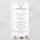 Flores e folhagens de aquarela em rosa claro e ameixa, programa de casamento. O programa apresenta caligrafia fofa de "casamento" com várias linhas para listas de texto personalizadas para a ordem dos eventos da cerimônia, festa de casamento e nota de agradecimento.