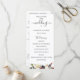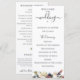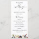 Flores e folhagens de aquarela rosa claro e ameixa, programa de casamento. O programa apresenta caligrafia fofa de "casamento" com várias linhas para listas de texto personalizadas para a ordem dos eventos da cerimônia, festa de casamento e nota de agradecimento.