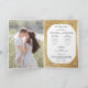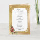 Crie um casamento no inverno inesquecível com este elegante design de programa dobrado de férias com um spray de pelúcia de rosas de Natal, poinsettia, colly e pinho, etiqueta branca com uma borda de ouro ornamentado e um fundo metálico de cor damasco de ouro metálico falso opulente. Dentro apresenta um modelo de fotografia.