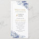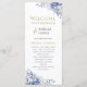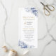 Este elegante programa de cerimônias de casamento apresenta delicados florais de aquarela em tons de azul macio e de ouro luxuoso, agora colocados contra um fundo branco limpo para uma aparência nova e moderna. Ideal para casamentos clássicos ou minimalistas, este programa permite que você apresente lindamente sua ordem de cerimônia, festa de casamento, leituras ou uma mensagem obrigado-você. Personalize facilmente ambos os lados com seus detalhes exclusivos. Coordena-se perfeitamente com a suíte de Casamento Azul e Dourado em Pó de cheio para um jogo de papelaria de casamento elegante e coeso.