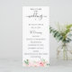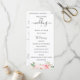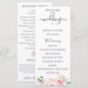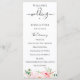 Flores em aquarela rosa corado elegante e folhagem verde delicada, programa de casamento. O programa apresenta uma caligrafia fofa de "casamento" com várias linhas para listas de texto personalizadas para a ordem dos eventos da cerimônia, festa de casamento e nota de agradecimento.