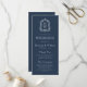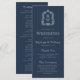 Este elegante programa de casamento inspirado em vintage apresenta um par de iniciais monográficas brancas em letra serif aberta acima e abaixo de uma linha divisória e rodeadas por uma crista botânica de arte em linha num fundo azul marinho.
