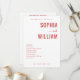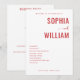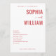 Este programa de casamento apresenta um design minimalista e elegante com um fundo suave esbranquiçado. O layout é centrado em torno de fontes serifadas vermelhas e negritas para os nomes "SOPHIA" e "WILLIAM", separados por um delicado "e" em letra cursiva. Os detalhes da cerimônia são listados de forma organizada em uma fonte sem serifa limpa, mantendo um clima sofisticado e formal. A paleta de cores de vermelhos suaves e neutros melhora a legibilidade e concentra a atenção nas informações essenciais, tornando-o perfeito para uma celebração de casamento chic e moderna.