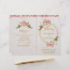 Um programa de casamento dobrado sobre fundo de mármore, com decorações de orquídeas cor-de-rosa e branca e um hexágono de ouro irregular em volta do texto no cobrir frontal, com orquídeas cor-de-rosa para cima e para baixo sobre ele. O texto tem uma cor de ouro, como o hexágono-ouro, e os títulos e os nomes do noivo e do noivo são escritos em um roteiro caligráfico elegante. Tem a cerimônia de casamento e a festa de casamento na dentro e uma obrigado que você manda no cobrir traseiro, com uma pequena decoração de orquídeas acima. No dentro, tem orquídeas cor-de-rosa na borda superior. As orquídeas são de um buquê de flores de vintage com orquídeas cor-de-rosa e branca de um cartão de saudação de Bertha Maguire (1862-1910), agora no dominio público.