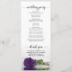 Este belo programa de casamento apresenta uma elegante design com um solteiro longo e enrolado rosa roxo real profundo e roxo, deitado do seu lado refletindo na água. Os títulos são escritos em caligrafia de rico, e há espaço para seus detalhes de cerimônia e festa de casamento, assim como um obrigado curto para seus convidados. É uma maneira maravilhosa de dar as boas-vindas aos seus amigos e familiares à sua celebração de casamento.