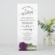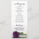 Este belo programa de casamento apresenta um design elegante com um solteiro longo, púrpura pálida de ameixa pálida ou rosa de berinjela, deitado do lado, refletindo na água. Os títulos são escritos em caligrafia de rico, e há espaço para seus detalhes de cerimônia e festa de casamento, assim como um obrigado curto para seus convidados. É uma maneira maravilhosa de dar as boas-vindas aos seus amigos e familiares à sua celebração de casamento.