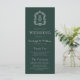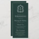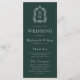 Este elegante programa de casamento inspirado em vintage apresenta um par de iniciais monográficas brancas em letra serif aberta acima e abaixo de uma linha divisória e rodeadas por uma crista botânica em uma camada verde de floresta escura.
