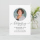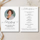 Personalize este programa simples e elegante com o nome, foto em um modelo circular elegante e mensagem de seu ente querido falecido. Honre e celebre a vida de seu ente querido com este modelo moderno e elegante. Fácil de personalizar texto e foto. Nossas sinceras condolências e orações estão com você durante este momento muito difícil.