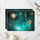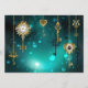 Chaves Douradas e antigas com engrenagens e marcadores penduram em correntes douradas sobre fundo verde luminoso.
