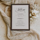 These elegant, simple wedding welcome programs feature a dark brown border and a romantic neutral color palette of espresso brown, creamy ivory, and soft mocha. There is a mix of classic text and modern calligraphy for a classy and minimalist design perfect for your timeless, formal or rustic country western wedding.
