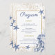 Guide your guests through your celebration with this elegant coastal themed wedding program card. This double-sided design features delicate dusty blue watercolor starfish and subtle gold sea kelp illustrations, framed by a chic gold geometric border. Perfect for a coastal, or beach-themed wedding. This custom ceremony program adds a beautiful, sophisticated touch to your seating area and serves as a lovely keepsake for your guests.