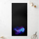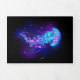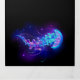 Água-viva grande, azul, desenhada artisticamente, brilhante, brilhante, com longos tentáculos sobre fundo preto com bioluminescência roxa. Água-viva luminosa.