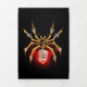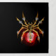 Aranha mecânica, com pá-pá de ouro, engrenagens de latão e uma lâmpada de vidro vermelha sobre fundo preto. Estilo Steampunk.