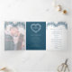 Mistura de arte botânica feita à mão num programa de casamento em forma de coração com fotos de duas páginas de cheio em azul escuro e branco de inverno de neve. Personalize este programa triplo de casamento com os seus próprios detalhes da cerimônia de casamento. Simples design de arte botânica circulando suas próprias iniciais de monograma em azul escuro e em branco. Outras cores e itens de casamento correspondentes disponíveis. © Original desenho e design por Sarah Trett exclusivamente para www.mylittleedenweddings.com na Zazzle.