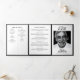 Modern trifold funeral program brochure with photo layout and elegant black and white typography offers a timeless and structured design ideal for memorial services and celebration of life events. This refined layout features a clean six-panel format that allows for clear organization of order of service details, eulogy, poem or prayer, and acknowledgments, making it easy for attendees to follow along during the service. The design combines classic serif fonts with subtle script accents to create a balanced and respectful aesthetic that feels both traditional and contemporary. A dedicated photo panel adds a meaningful personal touch, while the consistent border framing throughout enhances the polished and cohesive presentation. The monochrome color palette ensures high readability and a calm, understated tone suitable for honoring a loved one with dignity. Designed for those searching for a trifold funeral program with a photo and elegant minimalist style, this layout provides a professional and heartfelt way to present service information while creating a lasting keepsake for family and guests.