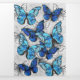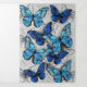 Composição vertical de borboletas de morfo realistas, azuis e brancas sobre fundo texturizado de cinzas. Borboleta azul Morpho.