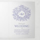 Programa de casamento de arte botânica em folha, desenhado à mão azul roxo, com a sua própria história de amor e seções de memória. Personalize este triplo programa de casamento com seus próprios detalhes da cerimônia de casamento, nomes de festas, história de amor e dedicações. Simples design de folha, circulando suas próprias iniciais monográficas em azul roxo e cinzas em um cartão branco. Outras cores e itens de casamento correspondentes disponíveis. © Desenho original em folha e design por Sarah Trett para www.mylittleedenweddings.com no Zazzle.