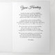 Honre as memórias queridas do seu amado com esta elegante modelo do programa de funeral "In Loving Memory". Projetada com sofisticação e graça, esta modelo oferece uma bela maneira de comemorar uma vida bem vivida. O clássico fundo branco e o saboroso texto preto criam um eterno e um aspecto sofisticado, fazer-o perfeito para qualquer serviço memorial, funeral ou celebração da vida. Este programa triplo personalizável apresenta vários painéis para incluir todos os detalhes essenciais do serviço. O cobrir exibe "In Loving Memory" em um script elegante e fontes serif simples, uma colagem comovente de 7 fotos de seu ente querido, o tipo de evento (por exemplo, "A Celebration of the Life of," "A Memorial Service Honoring," "A Funeral Service Honoring"), juntamente com o nome do seu amado, e as datas de nascimento e passagem. Dentro, você encontrará amplo espaço para o texto de sua escolha, como um obituário, a ordem de serviço, e uma leitura, oração ou poema selecionados. O primeiro painel de dentro também inclui 3 fotos. A aba interna apresenta uma colagem de 6 fotos. O painel traseiro permite confirmações, detalhes adicionais ou detalhes de recepção. Personalize cada seção para criar um tributo único e sincero, assegurando uma manutenção duradoura para que a família e os amigos se lembrem do seu amado.