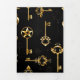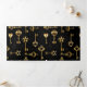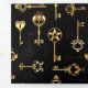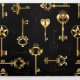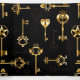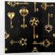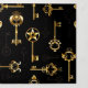 Padrão perfeito de chaves antigas, douradas e silhuetas em fundo preto.