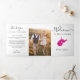 Bem-vindos convidados ao seu casamento com esta carta tripla. Há muito espaço para incluir seu itinerário, sugestões de restaurantes, coisas para fazer e informações de contato. Há espaço para uma foto na parte de trás da carta. Todo o texto pode ser personalizado, incluindo o título. Você pode editar as cores de qualquer parte desta design, assim como mover o coração para o local do seu casamento. Para alterar as cores, clique em personalizar e, em seguida, "editar usando a ferramenta design." Selecione o elemento que deseja editar e, em seguida, use as ferramentas para fazer as alterações.
