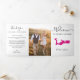 Bem-vindos convidados ao seu casamento com esta carta tripla. Há muito espaço para incluir seu itinerário, sugestões de restaurantes, coisas para fazer e informações de contato. Há espaço para uma foto na parte de trás da carta. Todo o texto pode ser personalizado, incluindo o título. Você pode editar as cores de qualquer parte desta design, assim como mover o coração para o local do seu casamento. Para alterar as cores, clique em personalizar e, em seguida, "editar usando a ferramenta design." Selecione o elemento que deseja editar e, em seguida, use as ferramentas para fazer as alterações.