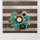 Relógio antigo e patenteado, adornado com joias, mãos de ouro e algarismos latinos com rosa de turquesa sobre fundo castanho e listrado. Estilo Steampunk.
