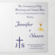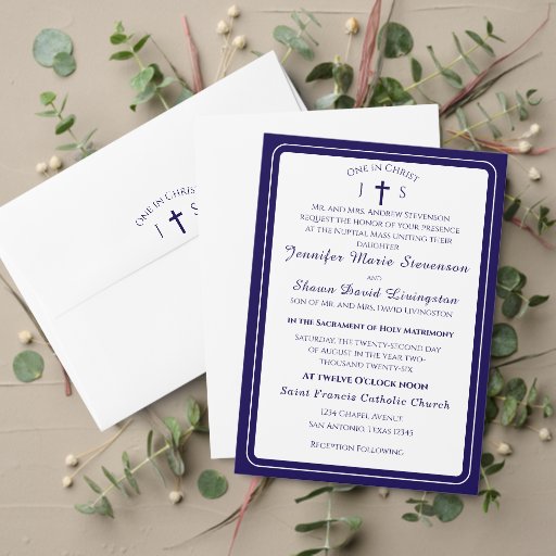 Interior is of a white background with navy-blue border. With explanations of the Mass displayed throughout, this elegant design also includes the name of the wedding officiant, names of altar servers, names of the parents of the bride and parents of the groom, wedding party names including the names for a maid-of-honor and best man, room for up to seven bridesmaids and groomsmen names, plus the names of the flower-girl and ring bearer. In addition, design of back cover features your text, a bible verse (or your message) and a prayer request for the happy couple against a navy background. All text is customizable. Designed to coordinate with the "Timeless Catholic Monogrammed Wedding Suite" collection.