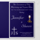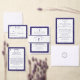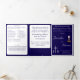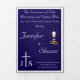 Interior is of a white background with navy-blue border. With explanations of the Mass displayed throughout, this elegant design also includes the name of the wedding officiant, names of altar servers, names of the parents of the bride and parents of the groom, wedding party names including the names for a maid-of-honor and best man, room for up to seven bridesmaids and groomsmen names, plus the names of the flower-girl and ring bearer. In addition, design of back cover features your text, a bible verse (or your message) and a prayer request for the happy couple against a navy background. All text is customizable. Designed to coordinate with the "Timeless Catholic Monogrammed Wedding Suite" collection.