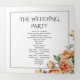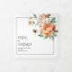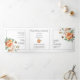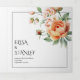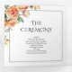 Este belamente tríplice programa para uma cerimônia de casamento e celebração mostra belas flores de pêssego complementadas por delicadas folhas verdes de sábio que enfeitam as esquinas. A peça do centro interior destaca uma ilustre fotografia do casal, criando um toque pessoal. Os nomes dos casais são exibidos elegantemente na tipografia decorativa, enquanto cada painel é elegantemente delimitado por linhas pretas delgadas, adicionando um acabamento refinado à apresentação geral.
