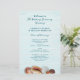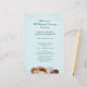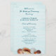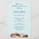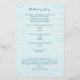 Programa de casamento em mar vivo impresso em papel de barato. Personalize o texto em ambos os lados sobre uma imagem de madeira azul-clara. Na frente, o fundo tem conchas e um dólar de areia realistas. O texto é cor azul-do-mar profundo e alterna entre o script e as fontes impressas. O espaço é dado no verso para uma pequena mensagem do casal. O tamanho do papel é 5,5 x 8,5.