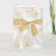 Linda menina em vestido branco e colar de cruz de ouro, olhos castanhos escuros. O fundo do convite é cetim branco, filigrana dourada, uma moldura de brilho dourado e prateado e enfeite de laço. A parte de trás é adornada com padrão de flor dourada e fita dourada em fundo de cetim branco.