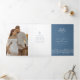 Flur de lis estilizada e primavera de flor branca de cinza azul e programa de desenho de arte de vinhas com duas fotos de cheio. Personalize com suas próprias iniciais de monograma, data do evento, detalhes da cerimônia de casamento, nomes de festas de casamento, palavras de obrigados e duas fotos especiais. Outras cores e itens de casamento correspondentes disponíveis. © Desenho manual original e design por Sarah Trett para www.mylittleedenweddings.com no Zazzle.