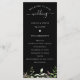 A Elegante cor d'água botânica, programa de casamento em preto. O programa apresenta sotaque de caligrafia bonitinho com múltiplas linhas para texto personalizado, incluindo cerimônia, ordem dos eventos, festa de casamento e nota de agradecimento. Projetado para combinar com nossa Coleção Botânica Elegante de Flor Selvagem.