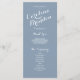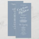 Uma tipografia branca deslumbrante em um fundo azul empoeirado faz com que esses elegantes programas de casamento modernos se destaquem. Desenhado por Elke Clarke © Personalize com a cor de fundo e todas as suas informações pessoais para um programa de casamento luxuoso que seus acompanhantes podem distribuir conforme seus convidados entram na igreja ou são acomodados onde a cerimônia irá ocorrer. Isso ajuda as pessoas a acompanharem durante a cerimônia, mas também serve como um lembrete para seus convidados. Você pode usar os campos do modelo para preencher as informações sugeridas sobre sua festa de casamento e ordem de serviço e mensagem de agradecimento ou selecionar "personalizar" e usar o menu de edição para alterar o espaçamento do texto, fontes, cores como desejar para criar seus próprios programas de casamento.