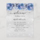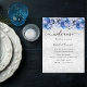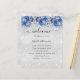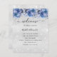 Um programa de casamento moderno e elegante, cronograma. Fundo com aparência de prata falso decorado com brilhos falsos e flores azuis. Personalize e adicione seus nomes e detalhes do casamento. Letras de cor preta. Se você tiver mais texto, é possível reduzir o espaço entre as linhas. Você também pode adicionar texto no verso.