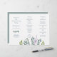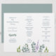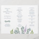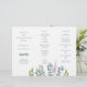 Modelo de programa de casamento com eucalipto dobrado. Dobre como um acordeão para usar na cerimônia. Um pequeno spray de folhas cinza-azuladas decora a frente (painel lateral esquerdo) logo abaixo dos nomes do casal. Mais verde e um ramo de lavanda "crescem" a partir da parte inferior do papel branco. O verso é de cor cinza-azulada sólida.