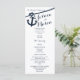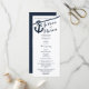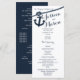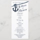 Ancoragem e corda programas de casamento com cartão de rack impresso a design náutico em texto azul escuro de marinho.