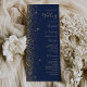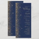 A borda esquerda deste elegante programa de casamento moderno apresenta um design de brilho dourado. O texto personalizável combina uma letra pálida de cor dourada, uma letra copperplate e uma letra itálico num fundo azul marinho.