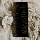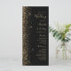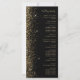 A borda esquerda deste elegante programa de casamento moderno apresenta um design de brilho dourado. O texto personalizável combina manuscrito colorido de ouro pálido, fontes copperplate e itálico em um fundo preto.