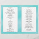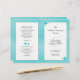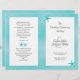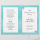 Os temas tropicais, aqua e branco, dobrados (pelo cliente) pela modelo do programa de casamento feito para uma longa cerimônia católica, permitem adicionar muito texto a todas as quatro páginas. Escrituras cristãs ou versos podem ser adicionados à página de trás juntamente com um obrigado que você envia para a família, amigos e convidados.