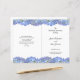 Programas de casamento florais azuis. Os programas dobrados são brancos com hydrangea azul, bordas florais na frente e texto preto. O texto é longo o suficiente para ser usado em uma cerimônia católica com uma mensagem de obrigado na página de trás.