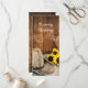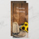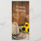 Dê aos seus hóspedes a ordem da cerimônia para seus núpcias casuais, mas clássicos, com o charmoso Chapéu de Cowboy, Girassóis e Barão Wood Country Western Wedding Program. Este programa de casamento do estilo rústico de rancho personalizado apresenta uma fotografia floral melhorada digitalmente de um chapéu de cowboy, buquê de flores de girassol amarelas, véu branco de brasa e lenço vintage aparado com lenço de linho, com uma pá e um fundo de madeira castanha e intacta.