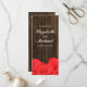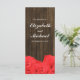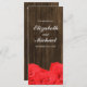 Um programa de casamento com o tema country com rosas vermelhas sobre um fundo de madeira marrom-escuro rústico. Personalize facilmente o seu evento.