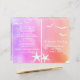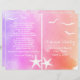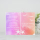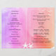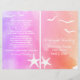 Um esplaxa de água rosa abstrato, roxo e coral moderno com estrelas e gaivotas praia cerimônia de núpcias dobradas e programa de festas com pintura de aquarela manual com textura, duas estrelas e gaivotas em branco e texto em branco.